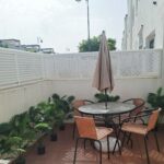 The master bedroom offers a king-size bed, built-in double wardrobes with drawers, and a private sun terrace furnished with comfortable seating. It also includes a television with a Firestick. The modernized bathroom features a walk-in shower.