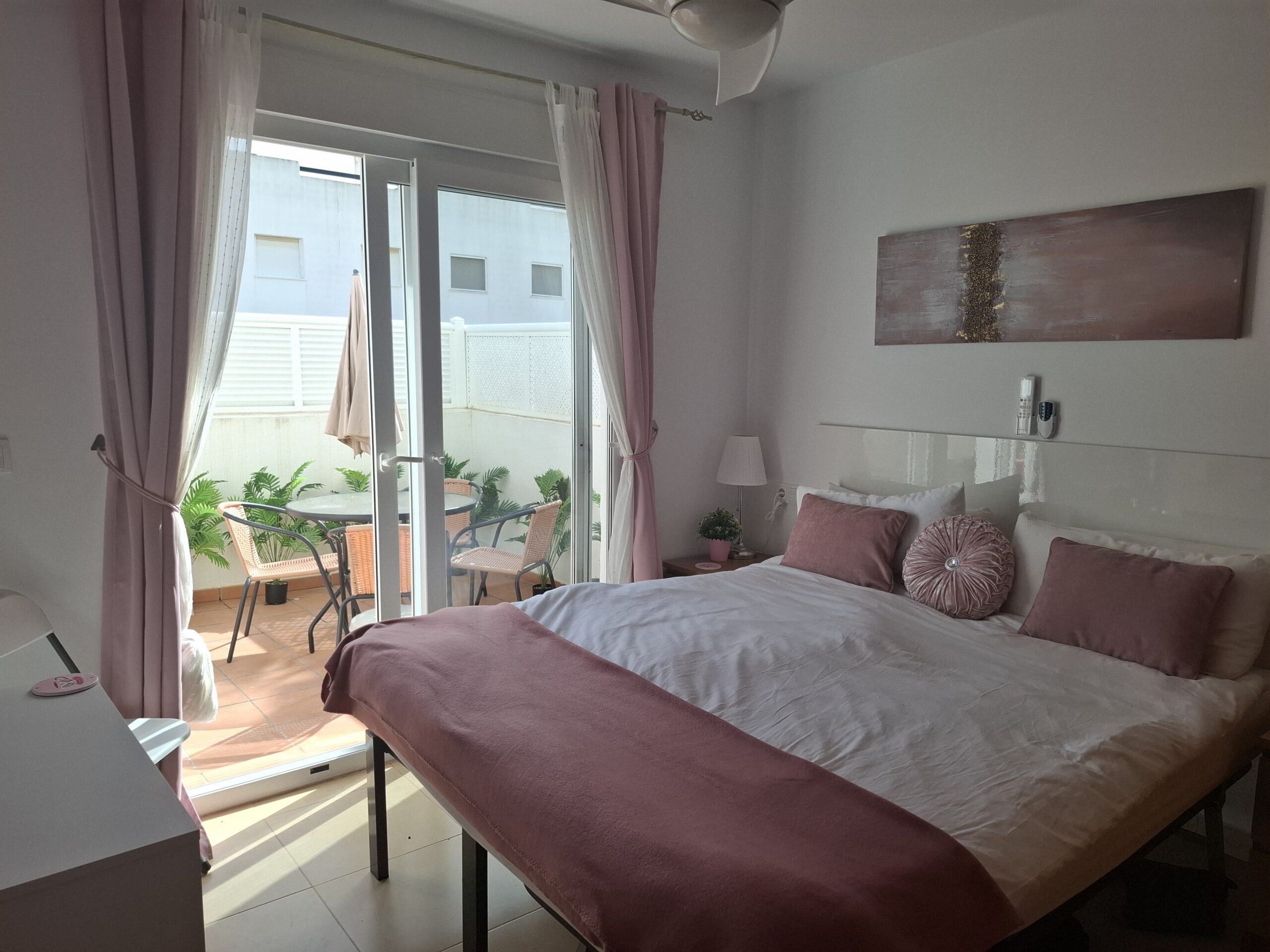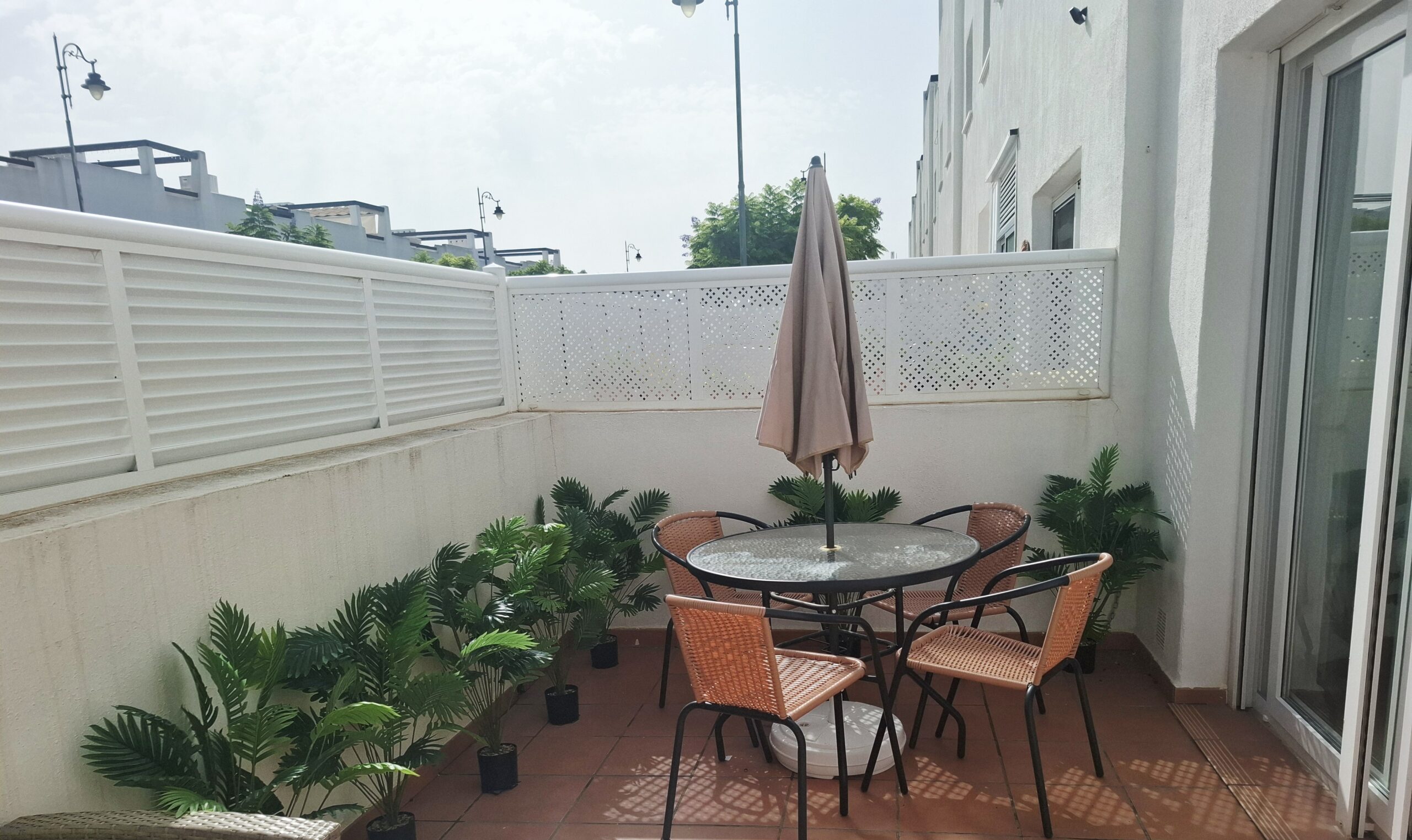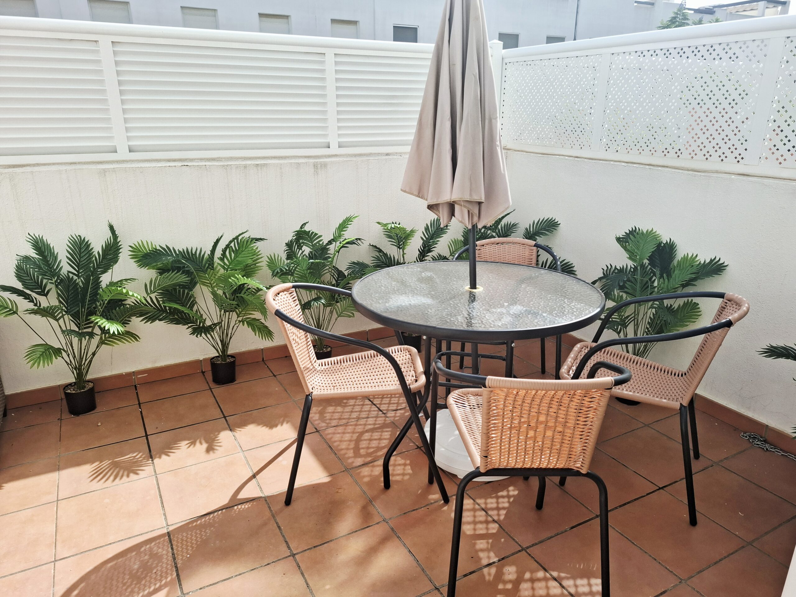 This south-west facing, ground-floor apartment is located in Jardin 10 and features three bedrooms. The open-plan living and dining area includes air conditioning, cable TV, and fiber Wi-Fi, and flows into a fully equipped kitchen with everything needed for self-catering.